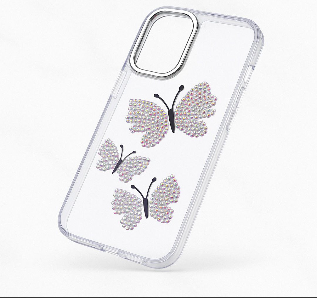 قاب فانتری دخترانه گوشی آیفون 13promax بیرنگ شفاف طرح پروانهای برجسته اکریلیک فانتزی محافظ موبایل